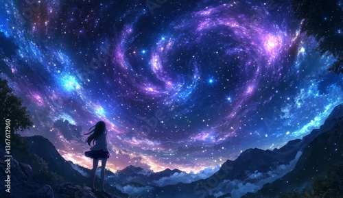 Girl Gazing at Cosmic Galaxy Above Mountaintop
