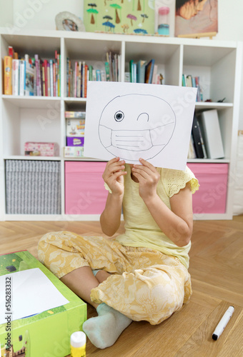 girl, holding, paper, emoticon, drawing, home, playing, 1, people, children, interior, elementary, sitting, cross-legged, obscured, face, art, creativity, room, idea, protective, mask, childhood, showing, caucasian, lifestyle, covering, picture, female