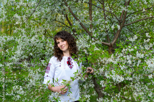 model, sit, long hair, curl, shirt, embroidery, good, smile, light, laughter, emotion, jean, fashion, shoe, style, nature, spring, flower, tree, green, april, may, nice, ukraine, look, portrait