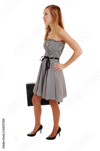 woman, briefcase, isolated, expression, elegant, dress, beauty, blond, attractive, background, black, body, caucasian, elegance, fashion, female, girl, heel, high, lady, leg, person, portrait, posing, pretty, sexy, short, smile, standing, studio, style, white, young, teenage