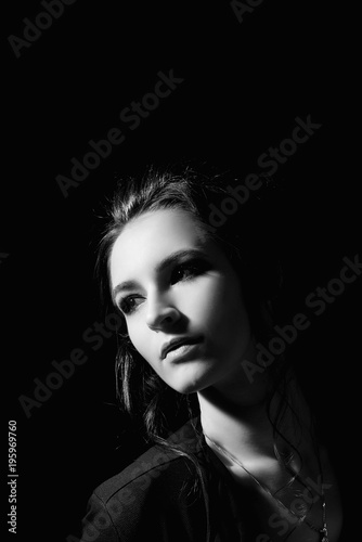 Girl in fashion style with professional make-up close-up on a black background in a low key