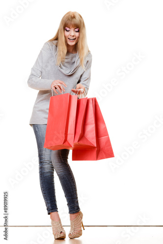 girl in full length with red shopping bags isolated