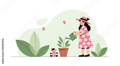 garden, girl, plant, pot, watering, can, leaf, flower, nature, care, butterfly, childhood, summer, drawing, spring, vector, growing, person, female, illustration, cute, happy, adorable, children, season, botany, teddy, bear, toy, flora, gardener, hobby, outdoors, backyard, lifestyle, design, botanical, environment, children, youth