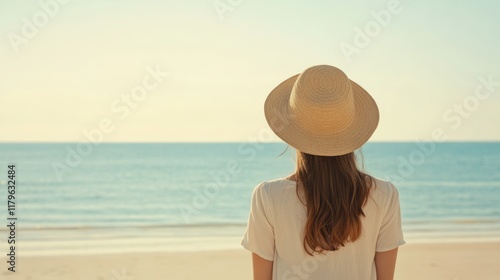Girl in straw hat gazing at tranquil ocean on serene beach during summer holiday, warm sunlight illuminating sandy shore and expansive sky.