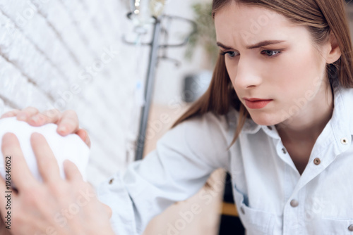 Girl is nursing elderly woman at home. They are holding hands. Girl is worried.