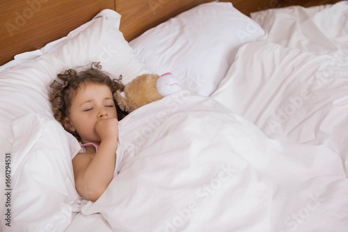 Girl lying in bed sucking thumb holding teddy bear with white duvet and pillows, copy space