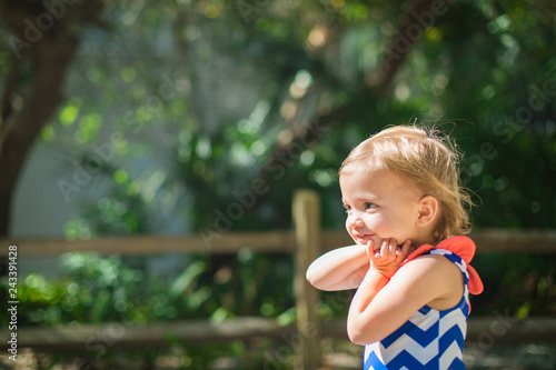 girl, children, caucasian, preschool, summer, swimwear, smile, fence, swimwear, striped, outdoors, day, people, alone, 1, lifestyle