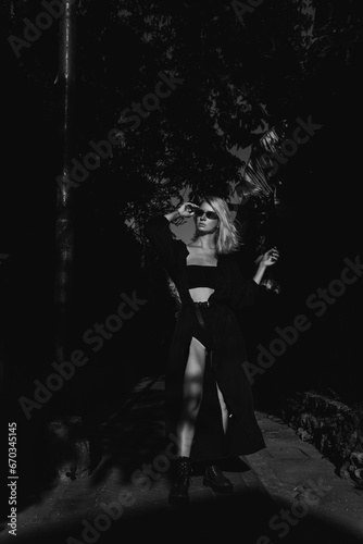 Girl posing on the street, black and white photography
