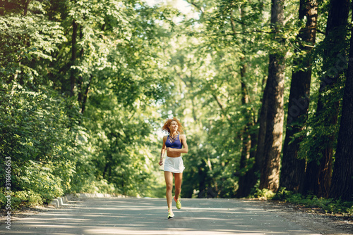 Girl training. Woman in a sports shorts. Redheads girl in a summer park