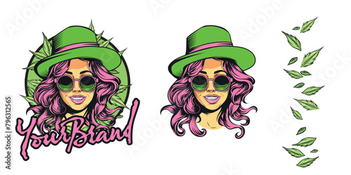 cartoon, girl, woman, ganja, lip, kiss, leaf, mouth, vector, illustration, lipstick, smile, beauty, design, art, nature, acid, logotype, green, eco, cannabis, pink, hair, face, flower, spring, flower, lady, floral, fashion, summer, glamour, eye, model