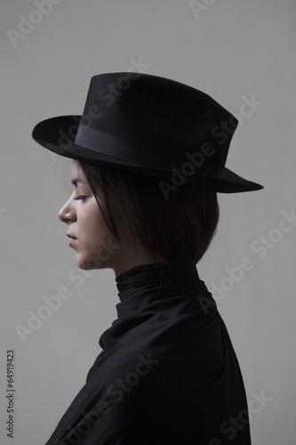 hat, girl, woman, beautiful, profile, head, isolated, black, white, classic, art, neoclassic, serious, brunette, casual attire, caucasian, dark, elegant, face, female, model, person, portrait, studio, stylish, woman, young