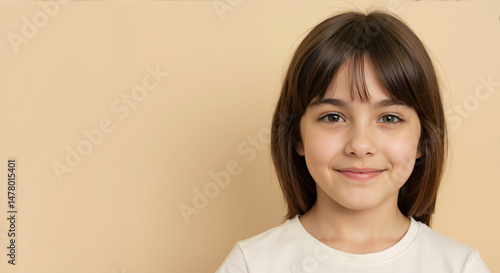 Girl with short brown hair and bangs in white top against beige background. Clean minimal portrait for youth marketing campaigns and school celebration materials