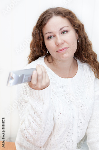 Girl with sour face changes channels television remote control