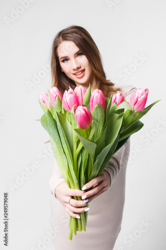 art, background, beautiful, beauty, birthday, blond, bouquet, bunch, caucasian, cute, decoration, easter, eighth, fashion, female, floral, flower, flower, gift, girl, green, happy, healthy, holding, isolated, love, march, model, natural, nature, pink, portrait, smelling, smile, space, spring, tulip, white, woman, woman, young