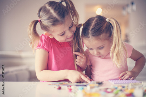 children, childhood, playful, color image, concentration, curly hair, cute, friendship, full-length, girl, horizontal, indoor, innocence, intelligence, learning, avocation, looking down, many-coloured, people, photo, sitting, skill, togetherness, toy, two people, brick, school, educate, looking, thinking, showing, finger, sister, family, smile, smiling, happy, fun, funny, kindergarten, lifestyle, toy, home
