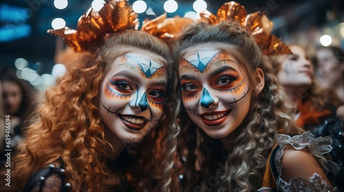 Girls with Halloween costumes taking selfie on a party celebrating with friends.