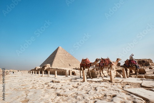 Giza, Egypt - December 24 2023: The Great Pyramid Khufu (Pyramid of Cheops) is the oldest and largest of the three pyramids in the Giza and camels