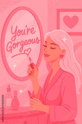 mirror, lipstick, pink, writing, glamourous, vanity, feminine, robe, cosmetic, glow, blond, girl, chic, cute, gorgeous, trendy, pastel, digital artwork, stylish, make-up, decor, luxury, illustration, sweet, confident, affirmation, elegant, minimal, vector, sparkle, girlie, modern, missy, beauty
