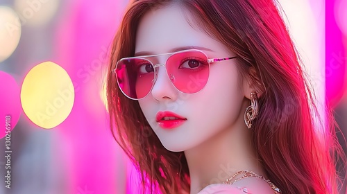 Glamorous woman with red hair wearing sunglasses and elegant earrings posing for a portrait, illuminated by vibrant pink neon lights