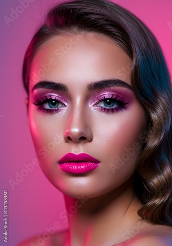 Glamorous Woman with Vivid Pink Makeup and Wavy Hair, Portrait in Studio Lighting.