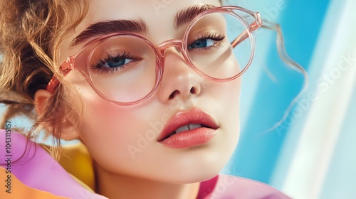 Glamorous young woman with curly blonde hair and stylish eyeglasses posing for a vibrant,colorful cosmetic and lifestyle editorial photoshoot in a professional studio setting.