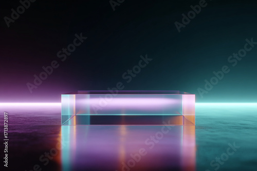 glasses, neon, futuristic, light, cube, modern, abstract, colours, glow, purple, teal, pink, background, block, minimal, three-dimensional, prism, tech, digital, transparent, vibrant, gradient, surface, lighting, geometry, clean, render, surreal, studio, spotlight, science fiction, design, concept, showcase, holographic