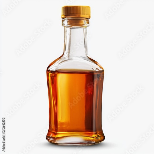 Glass bottle filled with amber liquid on a plain background showcasing its rich color and texture for culinary or beverage use
