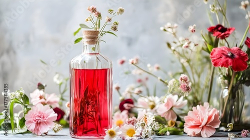 bottle, glasses, flower, floral, arrangement, bouquet, pink, white, red, daisy, carnation, nature, beauty, decor, still life, romantic, delicate, fresh, vibrant, natural, herbal, infusion, drink, elixir