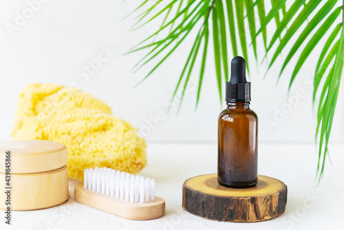 Glass bottle for cosmetic oil with brush, washcloth and palm leaf. Blank packaging without label for mockup. Natural organic cosmetics concept.