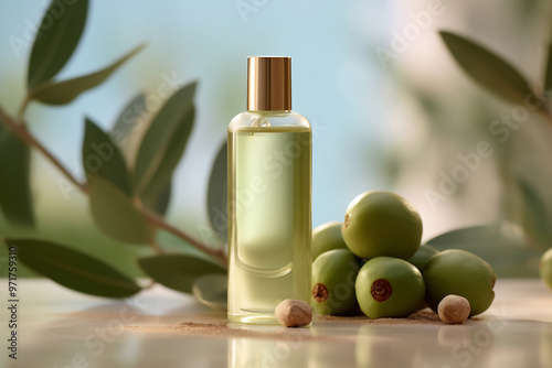 Glass bottle mock-up. Body treatment and spa. Natural beauty products. Blank bottle. Olive and olive branch