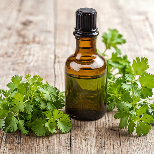Glass bottle of coriander essential oil with leaves, isolated on white background
