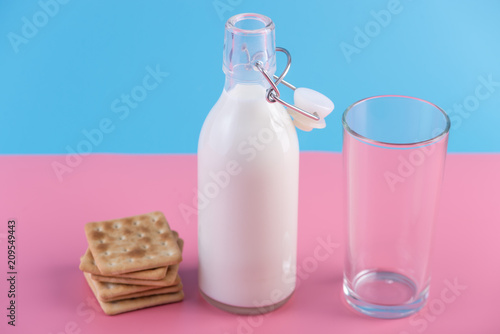Glass bottle of fresh milk and cookies on pastel background. Concept of healthy dairy products with calcium