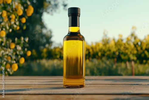 Glass Bottle of Olive Oil on Wooden Table Surrounded by Vibrant Lemon Trees in a Picturesque Vineyard Setting Under Bright Blue Sky