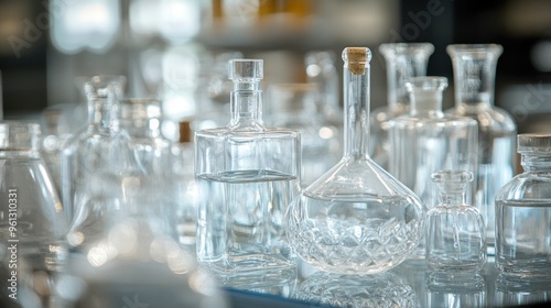 bottle, glasses, clear, transparent, container, liquid, empty, decor, display, shelf, surface, table, arrangement, row, group, collection, still, life, shape, design, form, composition, interior, vintage, style, minimalist, simple, clean, modern, light, bright, shiny, sparkling, closeup, macro, selective, sharpened, shallow, depth, of, field, blur, background, texture, glassware, object
