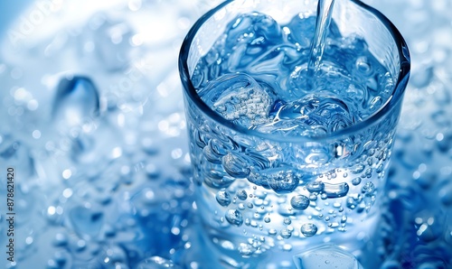 Glass cup being filled with mineral water. Glass with purified water in concept of refreshment and abundance of water.