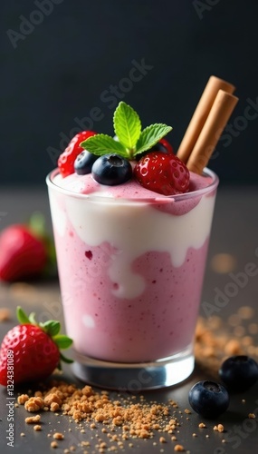 Glass cup filled with creamy dessert topped with fresh berries, mint leaves and cinnamon sticks, mint, berry dessert