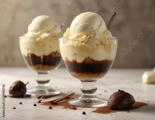 Glass filled with a layer of rich espresso and topped with vanilla ice cream scoops on a neutral surface , smooth texture, cold glass