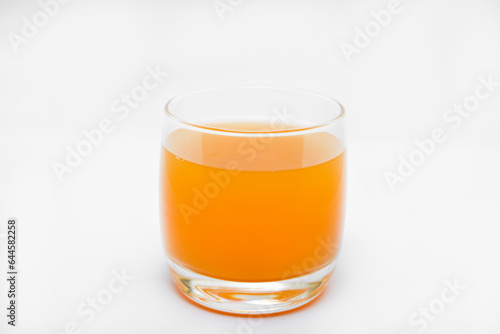 Glass glasses with orange juice on a white background. Delicious orange cooling drink.
