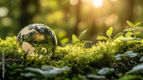 Glass Globe Representing Earth Resting on Green Moss in a Lush Forest