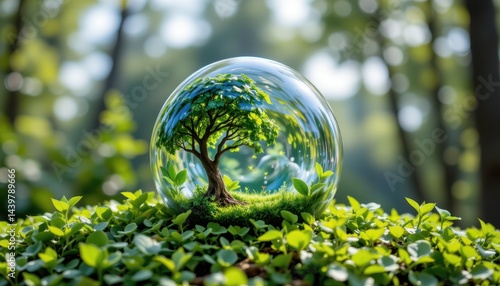 glass globe surrounded by vibrant green forest flora, symbolizing environmental sustainability, nature conservation