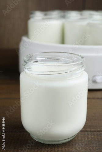 closeup, wooden, glasses, table, tasty, jar, yogurt, background, object, white, milk, maker, modern, technology, device, electric, appliance, machine, equipment, cook, delicious, food, healthy, ingredient, product, fresh, greek, homemade, dairy, fermented, yogurt, nobody, natural, epicure, nourishment, organic, cooking, diet, calcium, creamy