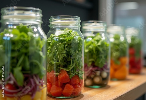Glass Jars Layered with Colorful Salad Ingredients on Wooden Surface