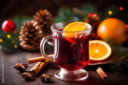 Glass mugs of mulled wine with spices and citrus fruits. Traditional hot drink or beverage, festive cocktail at X-mas or New Year