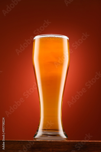 glass of beer, on wooden stand, with red background, object close-up, beer bubbles and foam