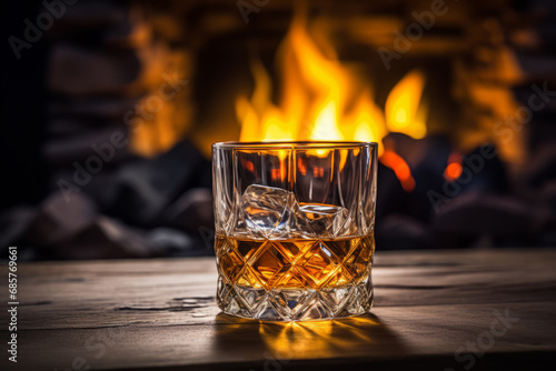 Glass of cognac or whiskey. Blur burning fireplace background.