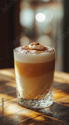 Glass of creamy latte with a cinnamon stick served in warm, soft lighting.