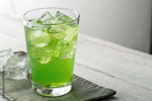 Glass of green lime juice with ice cubes, cool refreshment, electrolyte-rich drink, chilled beverage, juicy drink