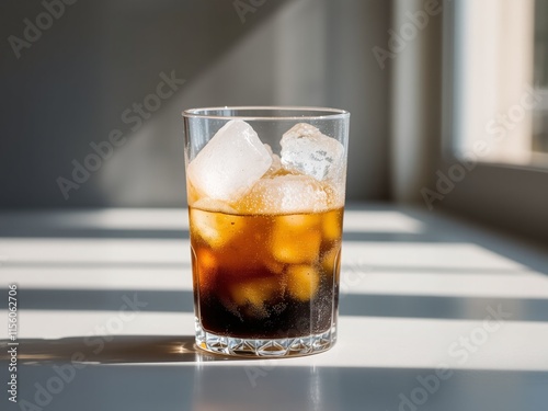 Glass of ice-cold cola with ice cubes, condensation on the glass, placed on a wooden table