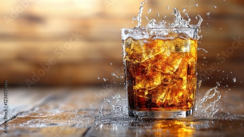 Glass of refreshing beverage splashing ice cubes on wooden table with blurred background