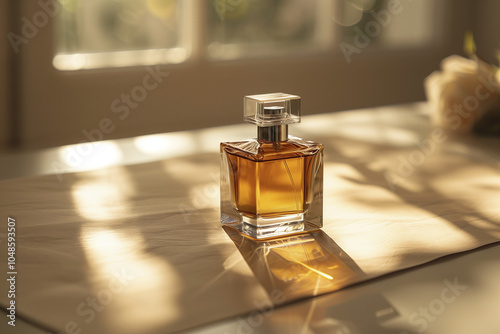 glass perfume bottle and perfume on the golden background. Present for wedding, Valentines, birthday for women. AI Generated